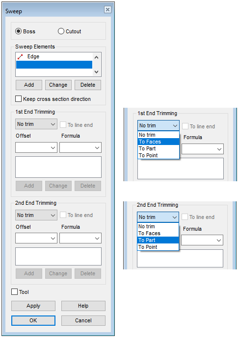 - Defines whether the sweep adds (boss) or removes (cutout) material.