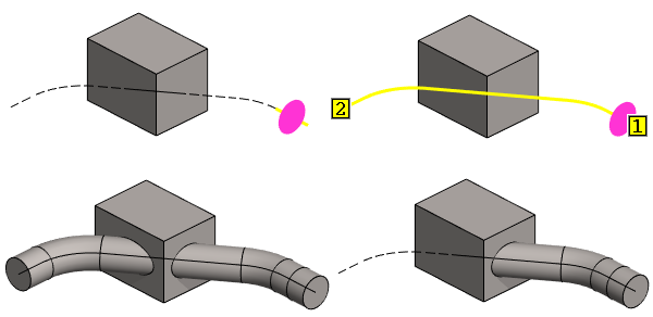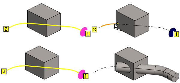 - Defines the trimming of the first end of the sweep feature to either an element selected from the model or prevents trimming. The ends are indicated in the model with the numbers 1 and 2. Select one of the following: