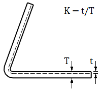 K-Factor as a geometric property refers to the relative position of the neutral plane within the sheet, which is demonstrated in figure 1. The neutral plane is the plane whose length doesn't change in the bend. K-Factor can have values between 0 and 1, but typically the values are between 0.3-0.5. The value 0.5 means that the neutral plane is at center of the sheet which means that the sheet doesn’t stretch at all. This is the same as the Vertex parameter program NOSTRETCH. The default value for the K-Factor is 0.5 but you can change it in the system preferences in the section bend (in administrator's view) with the keyword BendKFactor.