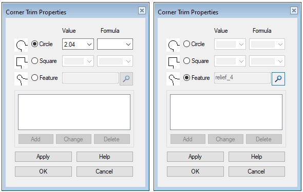 - Enter a variable and/or formula to control the radius of the circle or the length of the side of the square by using a dimension table.