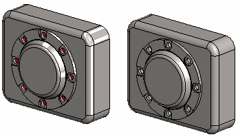 Add a machining feature to an assembly and position it using geometric constraints. The machining feature of the component is highlighted in the model with red color. Select execution of the machining features. The machining feature remains visible in the model.