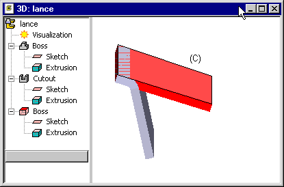 Figure 3: The bossing feature has now been modeled. Next, model the cutout feature. - Add a new sketch to the face of the sheet-metal part and draw the sketch (C). Extrude a boss and select