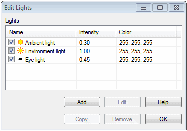 - You can select a light for editing by first selecting the light from the table, and then clicking the Edit button. Edit the light properties in the dialog box.