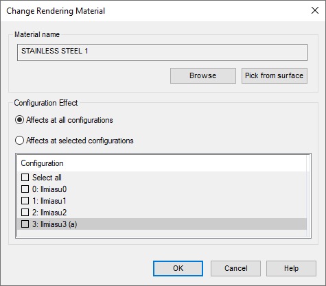 - Affects at selected configurations if you want to define individual rendering materials for configurations.