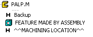 When the assembly is machined, the following symbols and features are displayed in the machined part's history, if the part has been imported to Vertex. The Backup means the history phase, in which the part is reversed to before machining, when the machining features are re-executed. A part can be machined using more than one machining feature. Each machining feature is displayed as a feature in the history with the convention Feature made by assembly. |