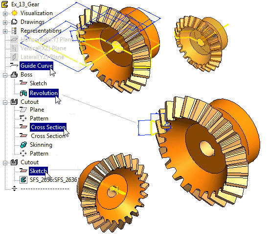 By previewing a feature or sketch you can easily see what the feature does. Select either a feature or a sketch in the feature tree, and the related geometry will be highlighted in the model.