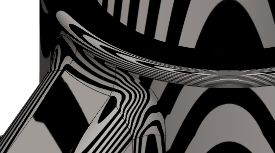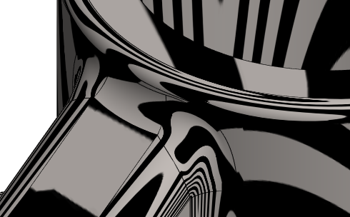 Seepra-varjostusta käytetään, kun tutkitaan vierekkäisten pintojen keskinäistä jatkuvuutta. Varjostus piirtyy tarkemmin, kun zoomaat mallia lähemmäs. Seepra-varjostukset vaihtuvat koskemaan kerralla kaikkia Vertex-työpöydällä olevia malleja.