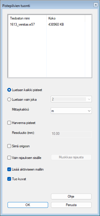 pistepilvitiedosto Ctrl-näppäin painettuna. - Valitse Pistepilvien tuonti -keskusteluikkunassa tuontiasetukset.