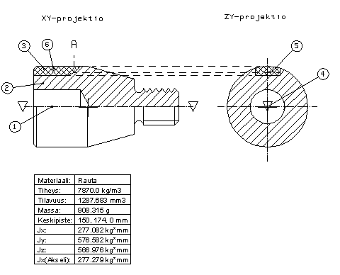 - Ei-pyörähtäville osille osoitat pyörähdyskeskipisteen ZY-projektiossa, leikkausviivoituksen ZY-projektiossa, sekä annat materiaalitiheyden.