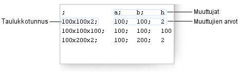 Taulukkotunnukseen määritetyt muuttujien arvot esitetään tiedostossa samalla rivillä kuin taulukkotunnus. Muuttujan arvo on enintään 16 merkkiä.
