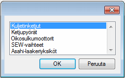 Toiminnolla lisäät komponentteja piirustukseen. Toiminnon valinta avaa valikon, josta voit valita Kuljetinketjut, Ketjupyörät, Oikosulkumoottorit, SEW-vaihteet tai Asahi-laakeriyksiköt.