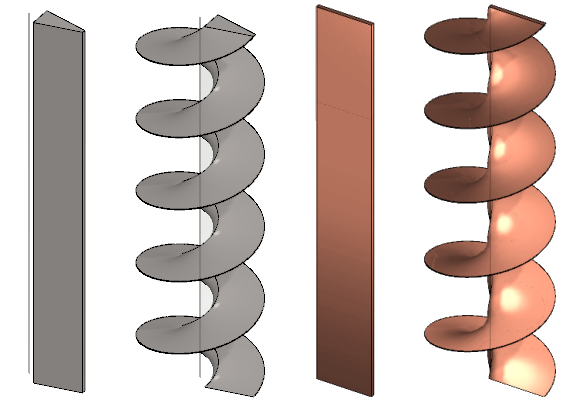 - Spiraalimaisten esineiden (kuljetinruuvit, jääkairat) mallintaminen sekä kiertämällä valmistettujen koriste-esineiden (hiilihangot, makkaratikut yms.) mallintaminen.