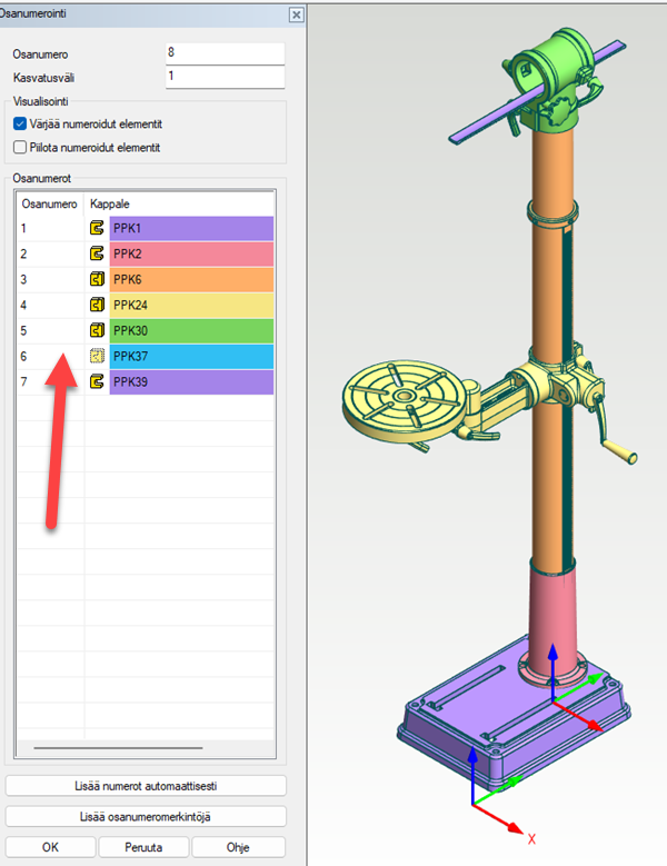 - Jos osoitat mallista sellaisen osan tai alikokoonpanon, jolla on jo numero, ohjelma aktivoi listalta rivin, jolle voit syöttää tarvittaessa uuden numeron.