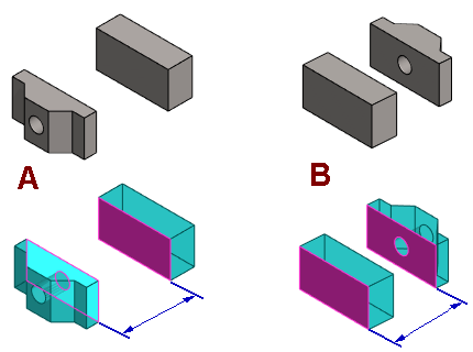 - Kuvassa B ehto on käännetty. Huomaa, että osan suunta muuttuu. (Pinnan normaali käännetään päinvastaiseen suuntaan).