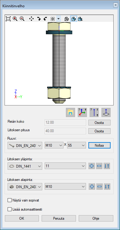 - Huomaa: Komponenteille on mahdollista antaa väärä tyyppi tai muuttuja, jonka vuoksi on mahdollista, että velho luulee ulkohalkaisijaa sisähalkaisijaksi tai ehdottaa mutteria ruuviksi.