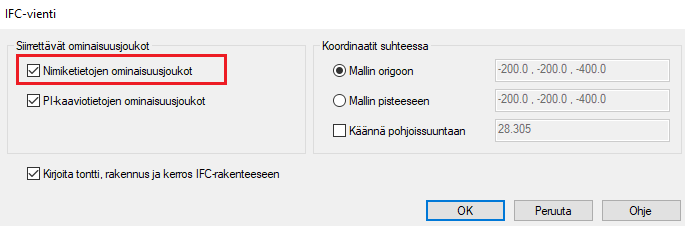 Käyttäjä voi kopioida pohjat vastaavaan paikkaa custom\setup\ifc- kansioon ja muokata ne sisältämään halutut kentät halutuilla tunnisteilla. IFC-viennissä nimiketietojen ominaisuusjoukkojen kirjoitus voidaan asettaa joko päälle (=oletus) tai pois päältä.