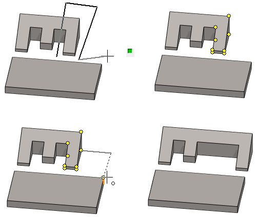 - Kokonaan alueen sisäpuolella oleva alikokoonpano siirtyy kokonaisena. Muutoin siirretään osasta valituiksi tulleita pisteitä, jolloin osan geometria venyy.