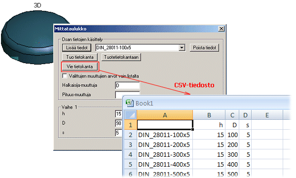 - Voit tulostaa 2D-komponentin ja 3D-komponentin mittataulukkotiedot ASCII-tiedostoon Mittataulukko-keskusteluikkunan toiminnolla Vie/Vie tietokanta. Voit tallentaa tiedot joko CSV- tai TXT-tiedostoon. Voit tehdä mittataulukon, kun olet tekemässä uutta komponenttia.