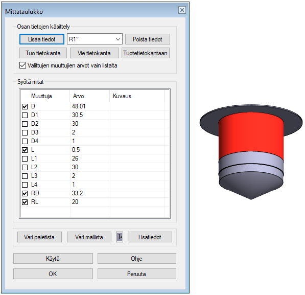 - Jossa kohtaan #CODE# tulee mittataulukkorivin tunnus #CODE!R1"#, kun komponentti lisätään kokoonpanoon ja mittataulukkorivi R1 on valittu.
