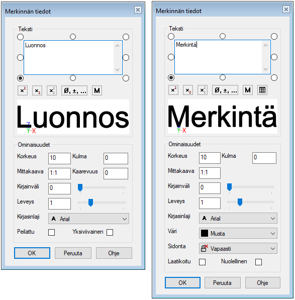 • Jos mittakaava on esim. 1:10, niin 3,5mm teksti näkyy 35mm korkeana.