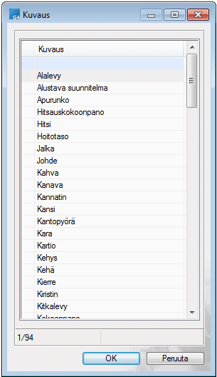 Avautuu Kuvaus-keskusteluikkuna. Muokkaa tietoja keskusteluikkunassa. Valitse luettelosta Kuvaus-teksti, ja valitse Lisää rivi edelle, Poista rivi tai Kopioi rivi. Valitse OK.