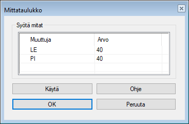 Mittataulukko.- Ohjelma avaa keskusteluikkunan Mittataulukko, jossa on kaksi saraketta; Muuttuja ja Arvo.