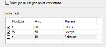Valittujen muuttujien arvot vain