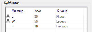 - Tunnuksen valinnan jälkeen osan työvaiheiden muuttujille asettuvat ne arvot, jotka kyseiselle taulukkotunnukselle on määritetty.