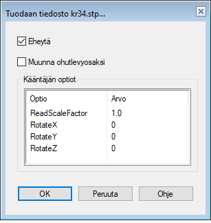 - Esim. jos luetaan SolidWorks:llä oletuskoordinaatistossa tehty malli ja halutaan se samassa asennossa G4:ään, niin PunX kiertymän (=kiertymä punaisen x-akselin ympäri) arvoksi pitää antaa 90 astetta.
