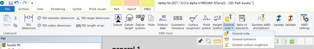 - Tässä dialogissa määritellään projektion perusasetukset sekä 2D-vientiin sisällytettävät annotaatiot. Dialogin avulla voidaan hallita näkymän suuntaa, esitystapaa, mittakaavaa sekä MBD-annotaatioiden ja screen space -annotaatioiden vientiä.