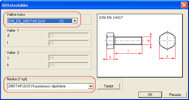 Mittataulukkotunnuksen valinnan jälkeen valitse osaan linkitettävä nimiketieto. Jatka seuraavasti: