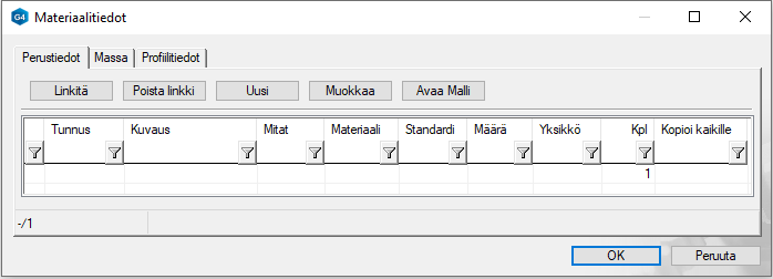 - Ohjelma avaa keskusteluikkunan Materiaalitiedot.