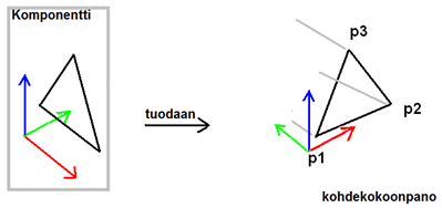SmartSnap-komonentin (värillinen) koordinaatiston kääntyminen.