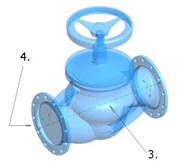 Kuvassa on venttiili, joka tuodaan Vertexin Tuo-toiminnolla esimerkiksi SAT-tiedostona. Jotta komponentti käyttäytyisi halutulla tavalla putkilinjan osana, on sille määriteltävä keskiviiva ja liityntäkahvat.