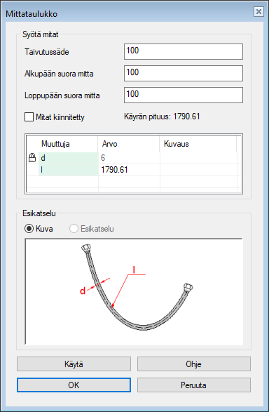 - Syötä letkun taivituksen minimisäde kenttään Taivutussäde.