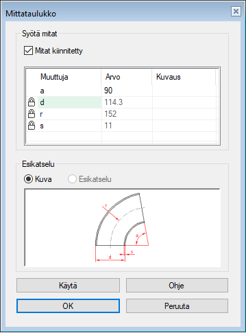 - Voi määritellä putkikomponentin tai putken mittoja mittataulukon avulla.
