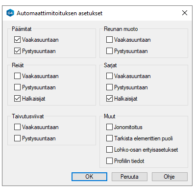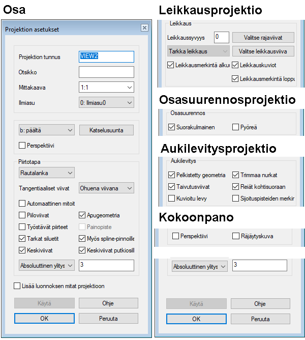 projektion kaarien mitoitus ei välttämättä onnistu.- Jos piirustuksen projektion muotoviivat piirtyvät vaillinaisesti, muokkaa projektiota ja vaihda tämä valinta.