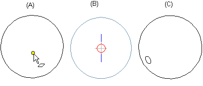 Pallopinta on alkeismuoto, joka voidaan lisätä kirjastopiirteenä malliin. Lisätään pallopintaan useampi kuin 1 luonnos siten, että kaikki 3 luonnosta sijaitsevat tietyssä kulmassa toisiinsa nähden. Valitaan pallopinta ja lisätään uusi luonnos pintaan. Pallopinnalla luonnostelutason kiinnityspiste määritetään 2 kulman arvona. Kun kohdistinta siirretään pallopinnalla (A), 2 kulman arvoa muuttuvat keskusteluikkunassa. Määritetään tarkka arvo: Kulma 1= 0, Kulma 2= 0. Piirretään luonnos (B) ja tehdään materiaalia poistava pursotus (C) koko kappaleen läpi. Tarkastellaan osaa isometrisessa projektiossa.