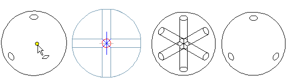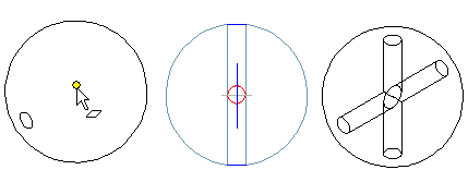 Mallinnetaan samanlainen piirre siten, että määritetään luonnostelutason kiinnityspisteeksi Kulma 1= 0, Kulma 2= 90. Tarkastellaan mallia Rautalanka-esityksenä. Piirteet risteävät kappaleen sisällä.