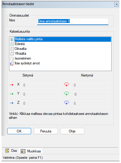 Annotaatiotasoa luodessa on mahdollisuus valita tason sijainti joko pinnan perusteella, käyttäen vakiovaihtoehtoja tai antamalla itse tason siirtymälle ja kiertymälle arvot.