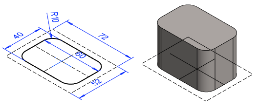Esimerkki, jossa on luonnosteltu pursotettava muoto ja ohjauskäyrägeometriaa.
