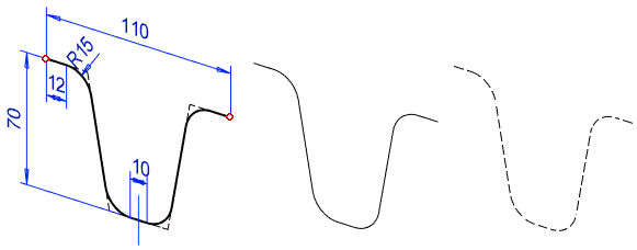- Jos haluat tehdä samalla pursotuksen ja lisätä myös ohjauskäyrän, käytä pursotuksen luonnosteluun viivatyyppiä Muotoviiva ja ohjauskäyrän luonnosteluun viivatyyppiä Ohjauskäyrä.
