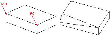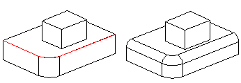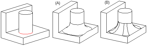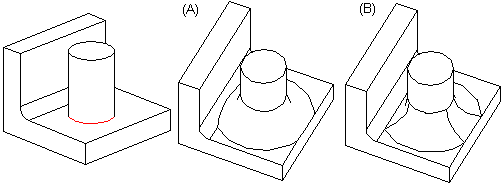 Lisätään pyöristys kahden pinnan liitoskohtaan. Pyöristys koskettaa terävän pinnan reunaviivaa. Pyöristys tehdään mukauttaen pinnan reunaviivat (A) tai reunaviivat ennallaan (B).