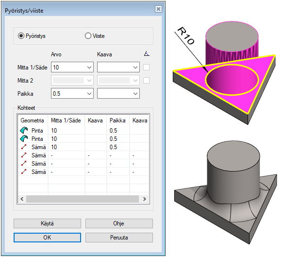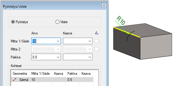 - Oletuksena pintojen välille tehdään vakiosäteinen pyöristys. Jos se ei mahdu kokonaan pinnalle, niin pyöristys muokkaa pinnan reunaviivoista spineviivoja.