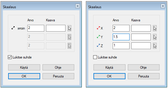- Voit skaalata osaa vakiosuhteella tai voit skaalata osaa antamalla oman skaalauskertoimen jokaisen osamallin pääakselin suhteen.