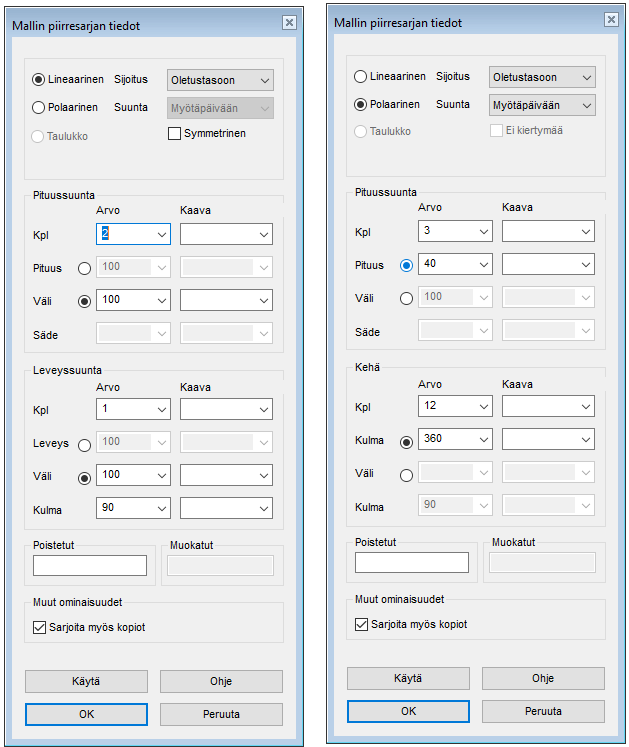 piirresarjalle määritetään mm sarjan jäsenten lukumäärä, pituus/leveys tai väli, kaava ja kulma.