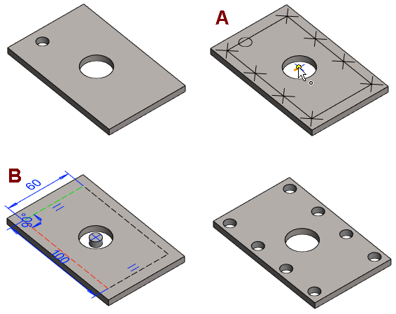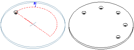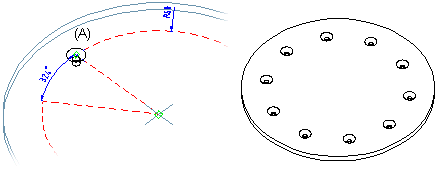 - Suositus: Anna säteeksi polaarisen piirresarjan säde ja sijoita sarjan keskipiste paikoilleen. Sen jälkeen sijoita piirre, esim. reiän keskipiste yhtenevyysehdolla apugeometriaan.