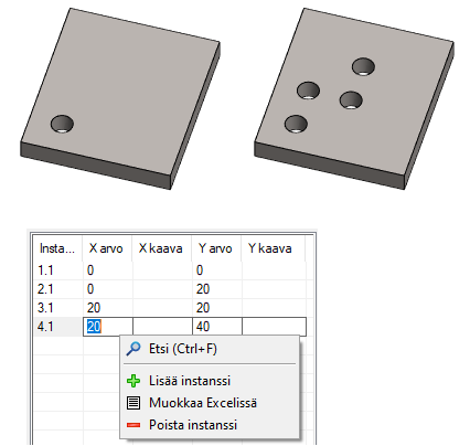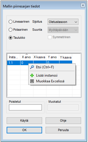 Lisää instanssi.- Voit poistaa taulukon rivejä tilannekohtaisella toiminnolla