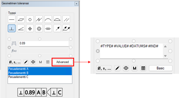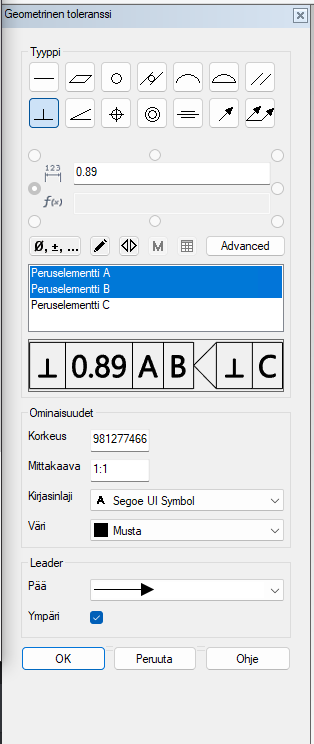 Etuliitteellä R / Ø / ø arvokentässä voidaan määrittää arvo joko radius/ diameter/ spherical tyyppiseksi, jolloin vastaava merkintä näytetään toleranssin arvon edessä