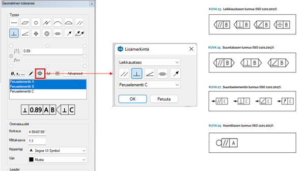 Geometristen toleranssien muut lisämerkinnät standardin ISO 1101:2017 mukaan: